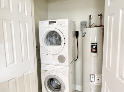 The updated kitchen includes stainless steel appliances and modern finishes, while both bathrooms are clean and contemporary with a marble-top vanity and full tub/shower. The unit also includes the convenience of a washer and dryer.